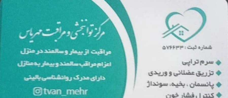 مرکز توانبخشی مهریاس در تهران در زمینه مراقبت از سالمند و بیمار،فیزیوتراپی،سرم تراپی و تزریقات آماده ویزیت زخم بستر در خدمت شما همشهریان عزیز می باشد.