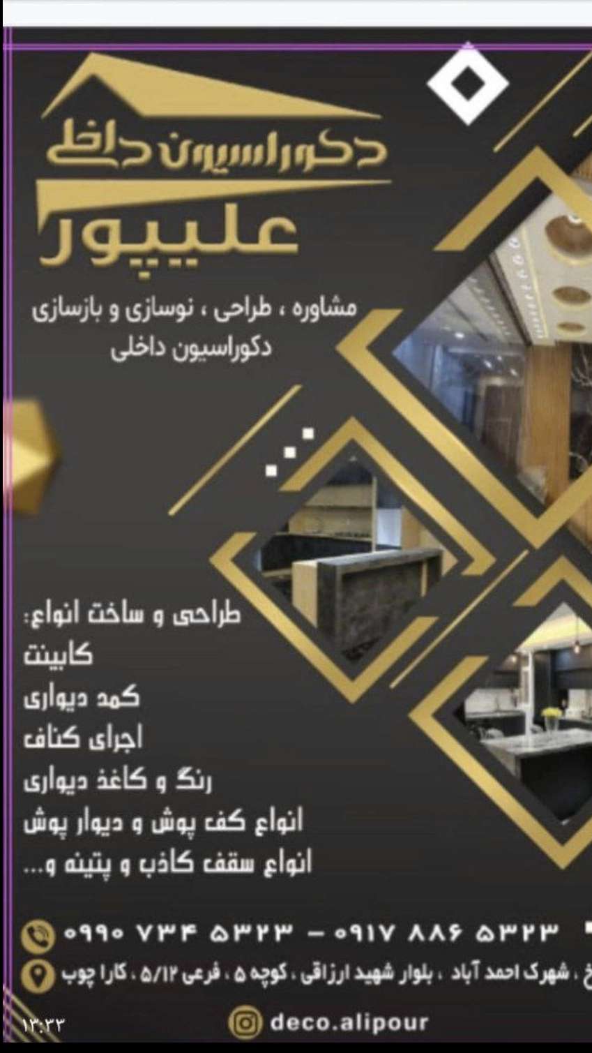 دکوراسیون داخلی علیپور در شیراز، طراحی و اجرای کابینت، کمد دیواری، کناف، بازسازی و نوسازی فضاها، سقف کاذب، دیوارپوش، کف پوش و پتینه با بهترین کیفیت و مشاوره تخصصی.