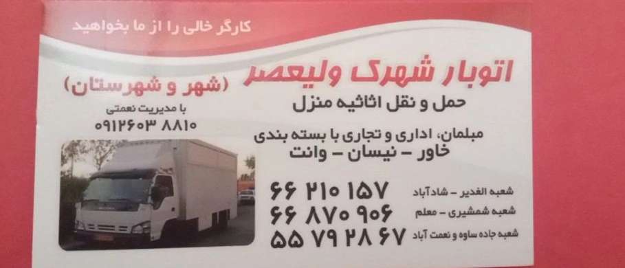 اتوبار علی نعمتی، حمل بار و اثاثیه منزل در شهرک غرب تهران -حمل و بار و اثاثیه منزل -وانت ،نیسان،خاور در شهر و شهرستان -باربری درتمام نقاط تهران